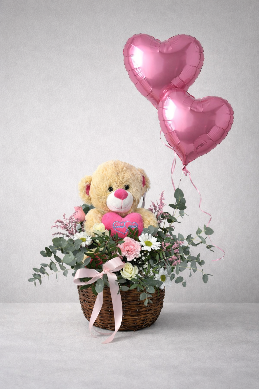 Cesta de flores con oso de peluche y 2 globos rosados con helio. Ideal para cumpleaños, aniversarios, nacimientos o sorpresas especiales. Personalízala a tu gusto