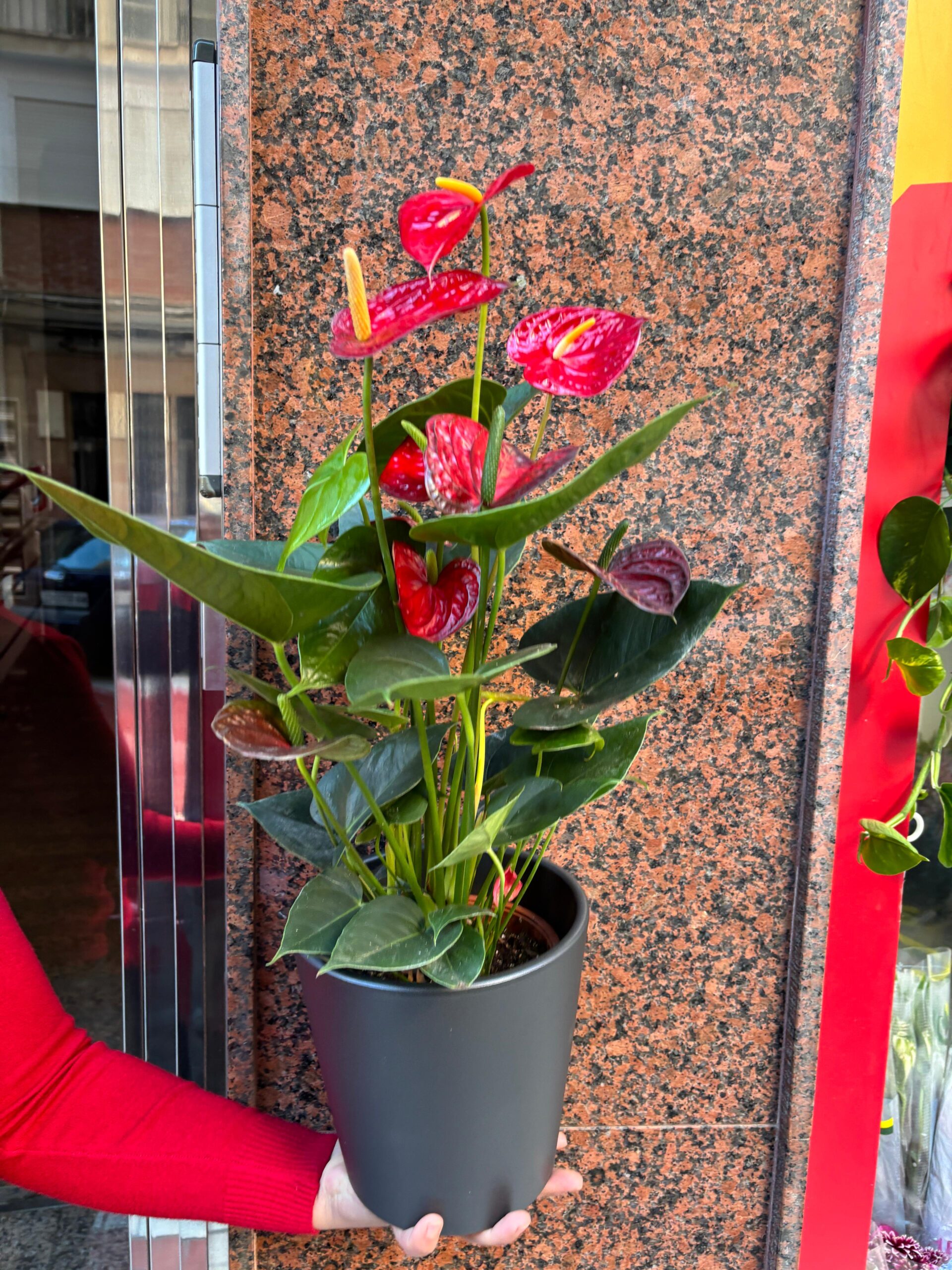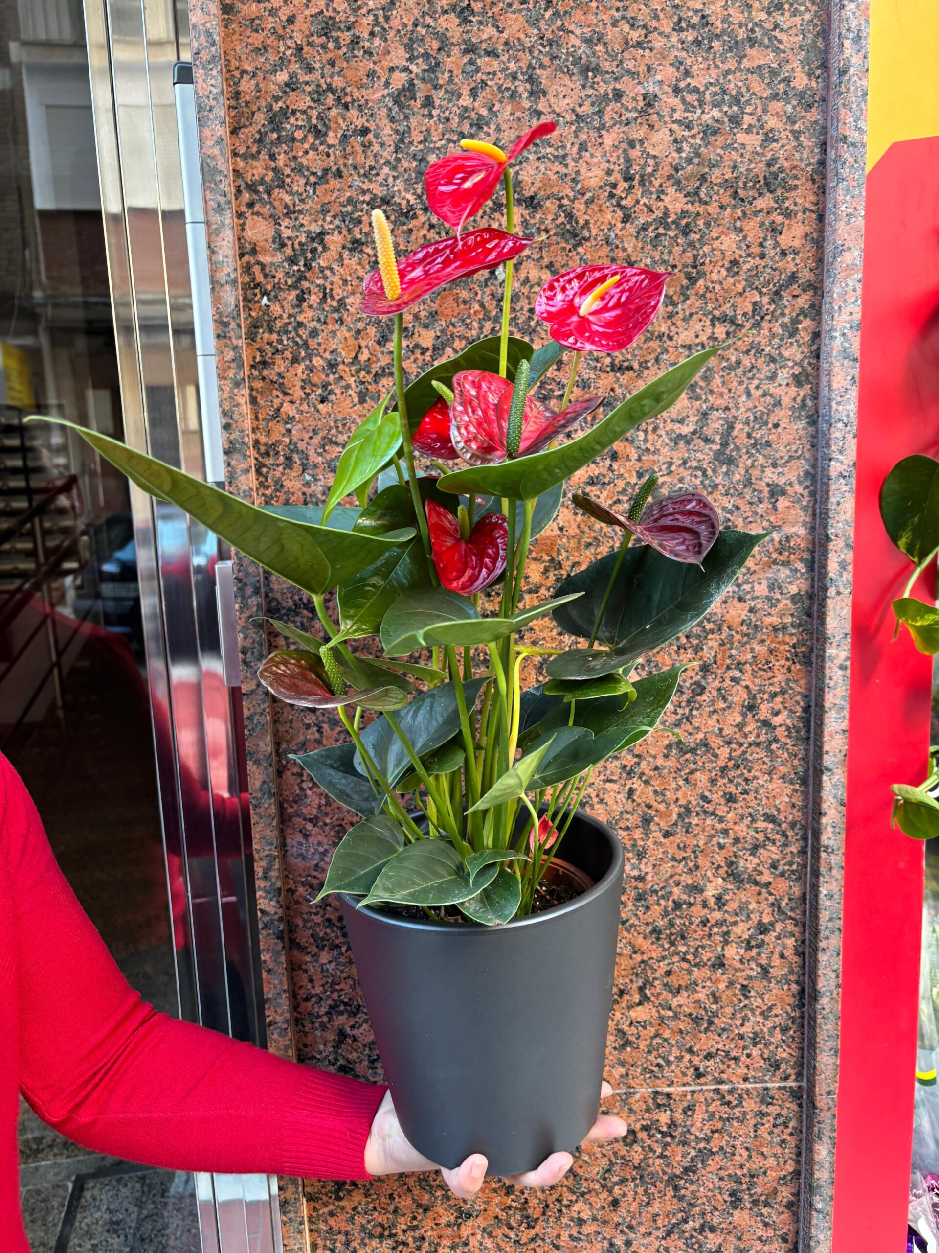 La planta de Anthurium rojo es un símbolo de elegancia y vitalidad, perfecta para decorar cualquier espacio con su intenso color y brillo natural. Presentada en una maceta de cerámica, este anthurium combina diseño y frescura, aportando un aire sofisticado tanto a hogares como a oficinas. Ideal como regalo de plantas a domicilio en Málaga, es una opción duradera y fácil de cuidar, que transmite amor, prosperidad y buena energía en cada hoja y flor.