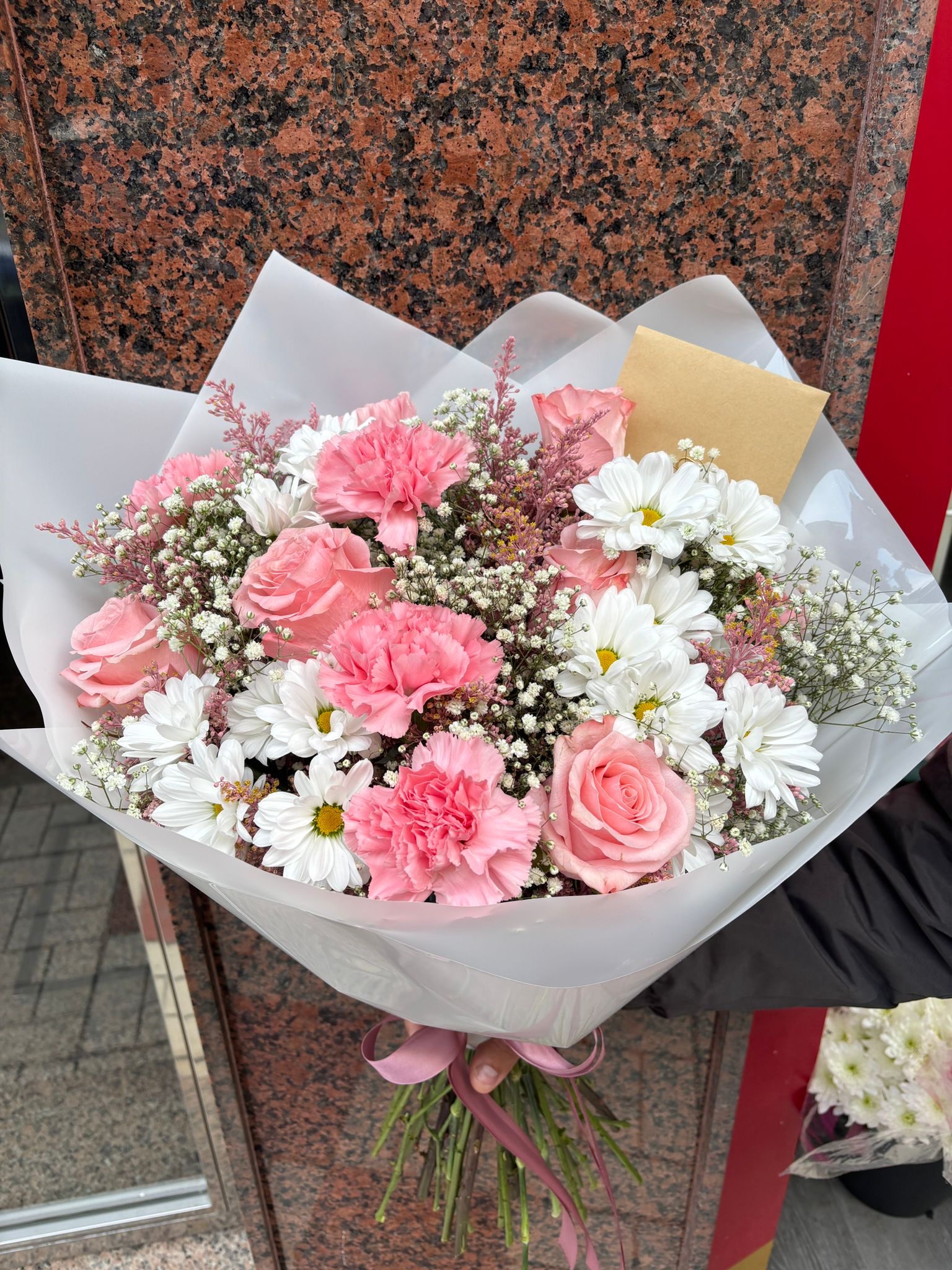 Los claveles rosados añaden volumen, textura y un toque romántico clásico, mientras que la paniculata envuelve el ramo con su aspecto ligero y etéreo, aportando suavidad y elegancia. El solidago rosado completa el diseño con pequeños toques de color que realzan el conjunto y le dan un acabado moderno y equilibrado.