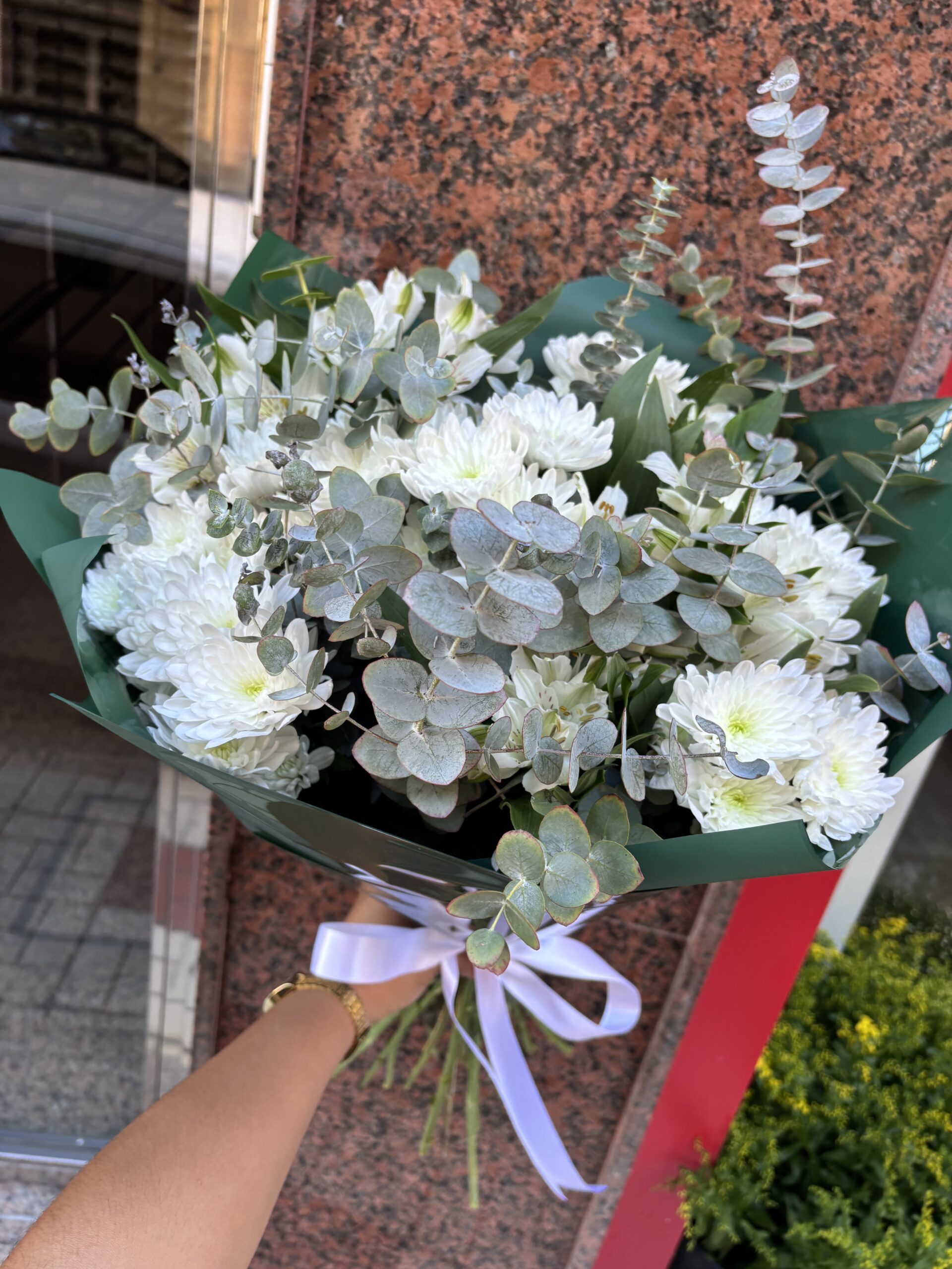 Descubre la armonía perfecta entre frescura y elegancia con nuestro ramo de crisantemos blancos, alstroemerias blancas y eucalipto. Cada flor ha sido seleccionada cuidadosamente para crear una composición que transmite pureza, serenidad y sofisticación.