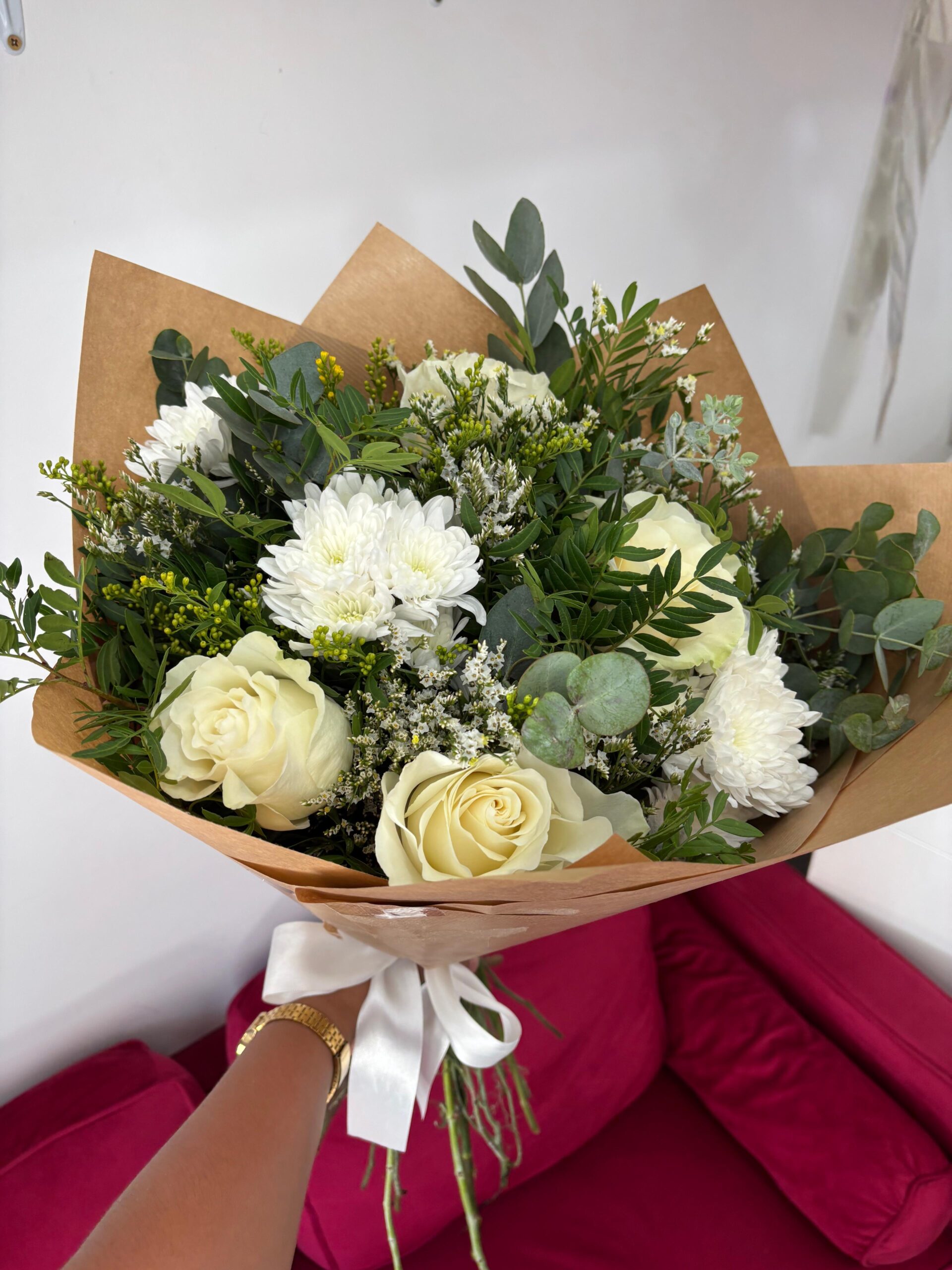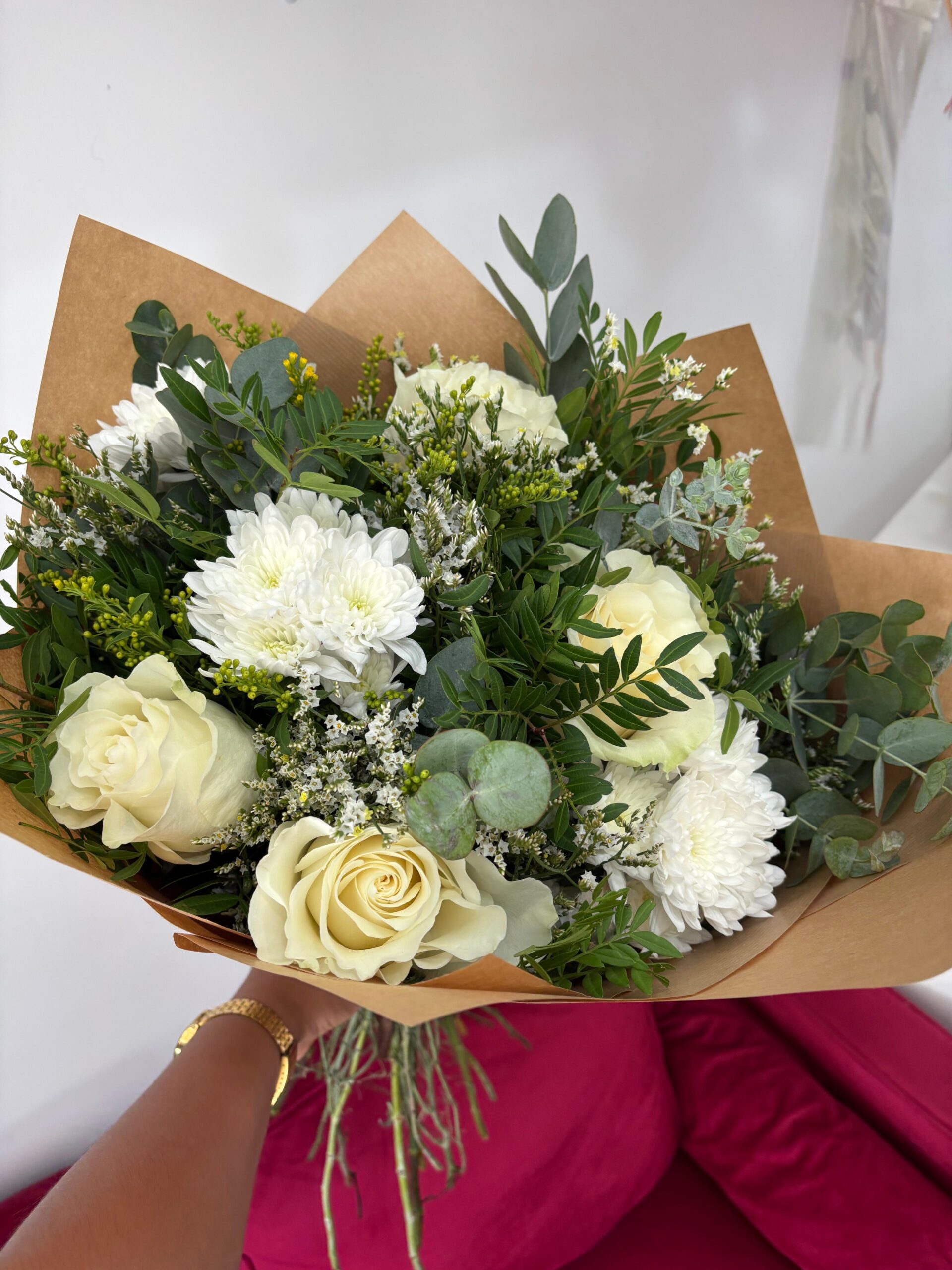 Este maravilloso ramo de flores blancas y verdes naturales ha sido diseñado con una exquisita base de follajes frescos como lentisco, eucalipto, solidago y limonium blanco, que aportan volumen, movimiento y un aire silvestre lleno de frescura. Sobre esta base se elevan 4 rosas blancas de gran belleza, símbolo universal de pureza, respeto y amor eterno, acompañadas por elegantes crisantemos blancos, conocidos por transmitir paz, serenidad y armonía.