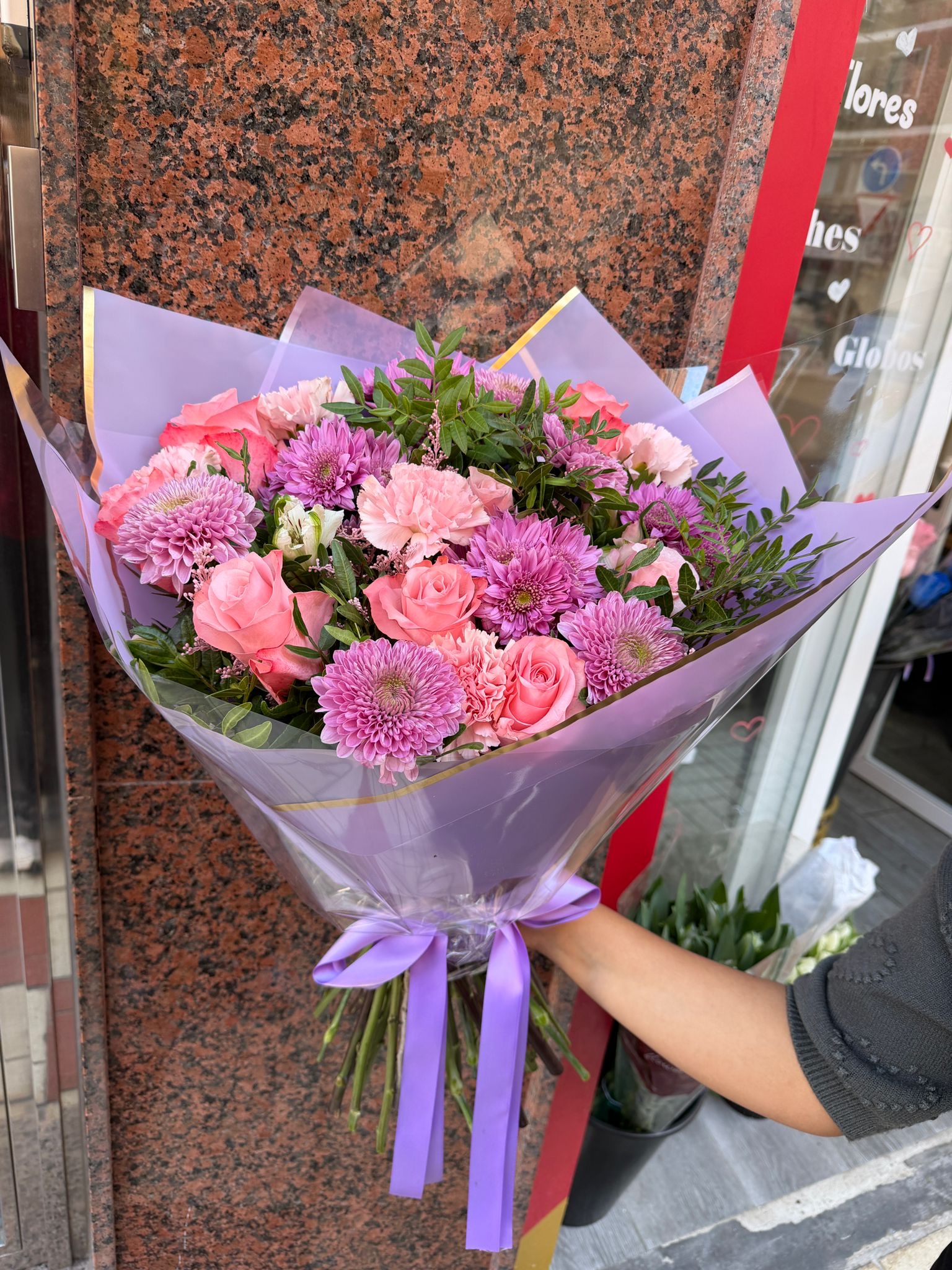 Cada flor de nuestro ramo lila es seleccionada con mimo para garantizar su frescura y belleza. Utilizamos rosas, unifloras, alstroemerias y verdes dispuestos de manera armoniosa, creando un ramo visualmente impactante y lleno de personalidad. Gracias a nuestro servicio de flores a domicilio en Málaga, tu pedido llegará puntual, fresco y listo para sorprender.