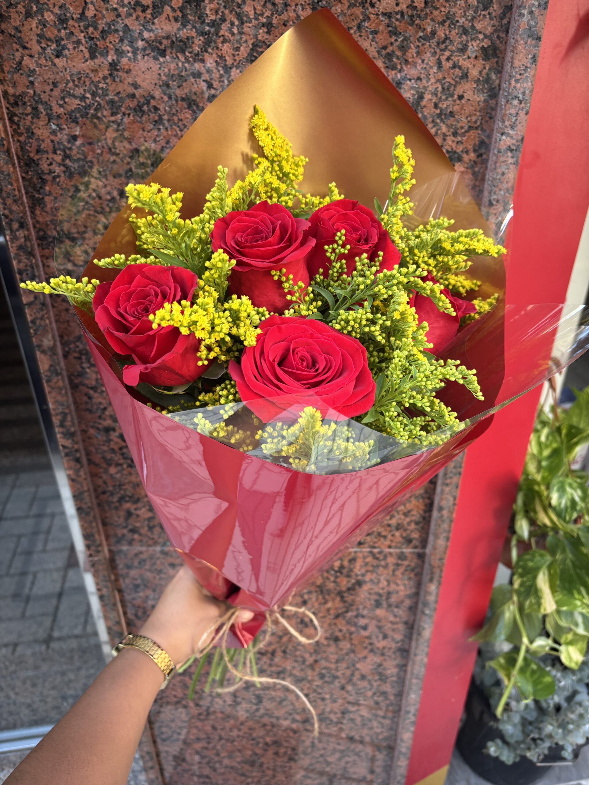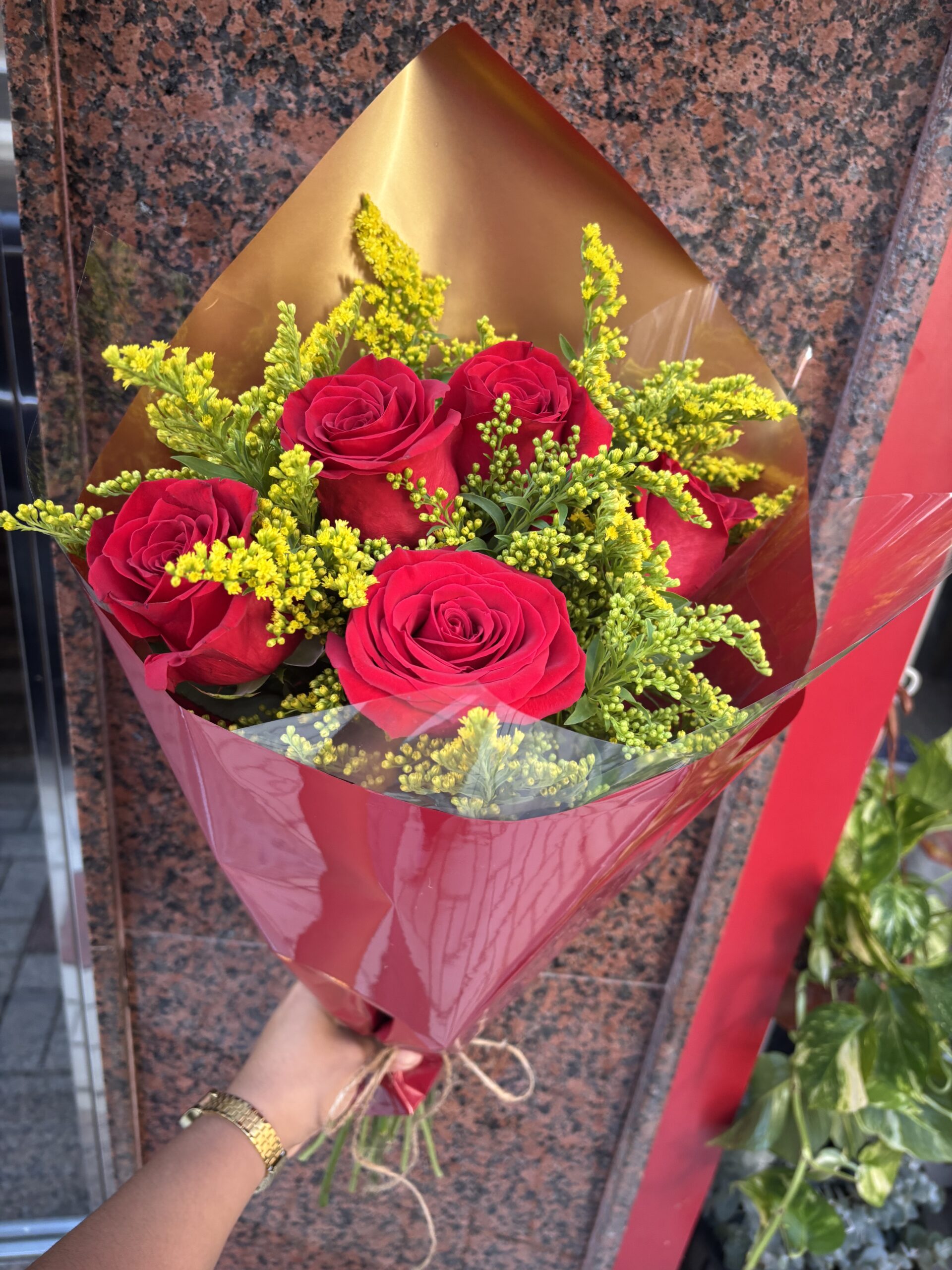 ¿Buscas un detalle que haga sonreír a alguien especial? Nuestro ramo de 5 rosas rojas frescas combinado con delicado solidago es la elección perfecta. Cada rosa ha sido seleccionada cuidadosamente para garantizar frescura, belleza y durabilidad, mientras que el solidago aporta un toque de luz y textura que hace que el ramo sea simplemente inolvidable.