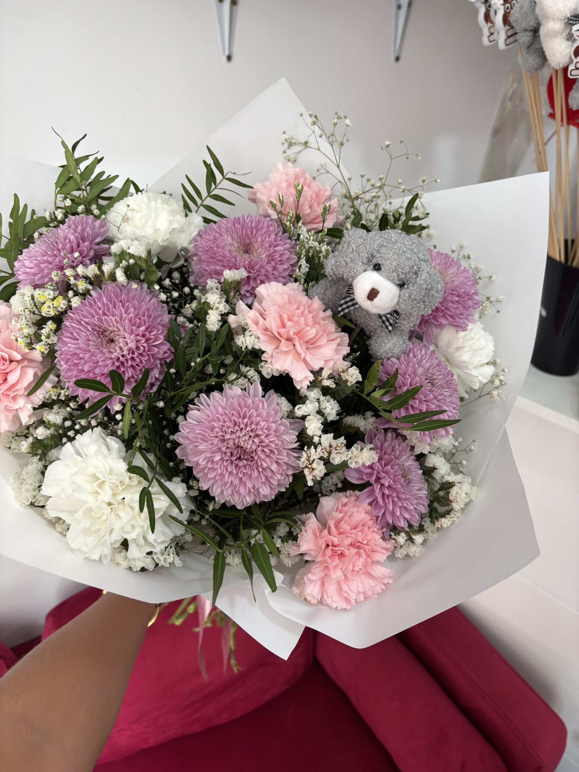 Este bonito arreglo se completa con un pick de mini peluche, convirtiéndolo en un detalle tierno y original, perfecto para cumpleaños, nacimientos, aniversarios o para alegrar el día de alguien especial.