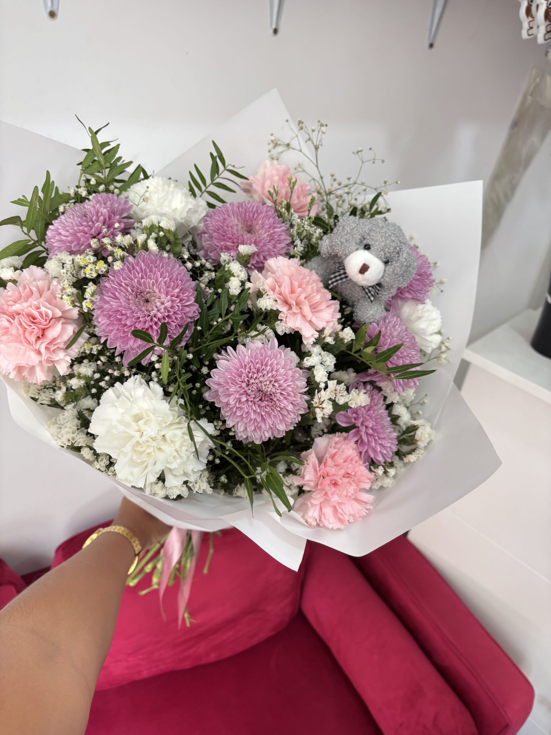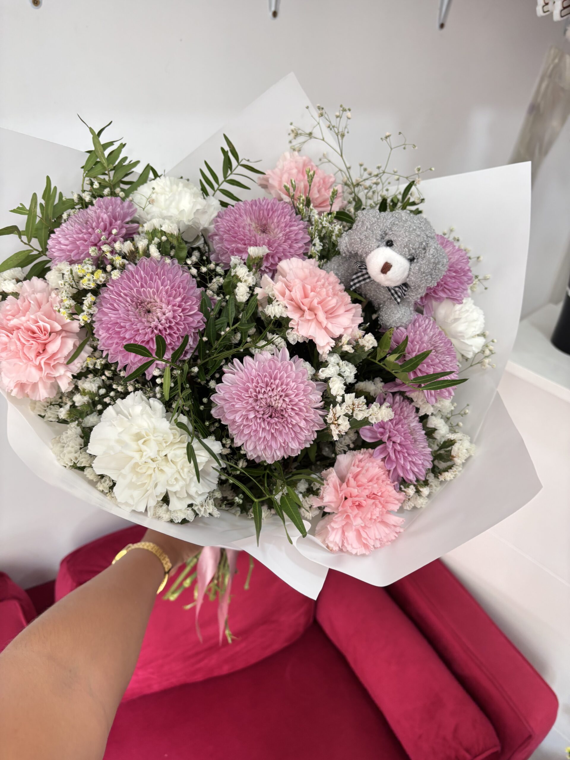 Sorprende con la dulzura y frescura de este ramo floral compuesto por una base verde natural, donde destacan 7 crisantemos uniflora y 6 claveles en tonos blancos y rosados, acompañados de limonium y paniculata que aportan volumen, delicadeza y un toque elegante.