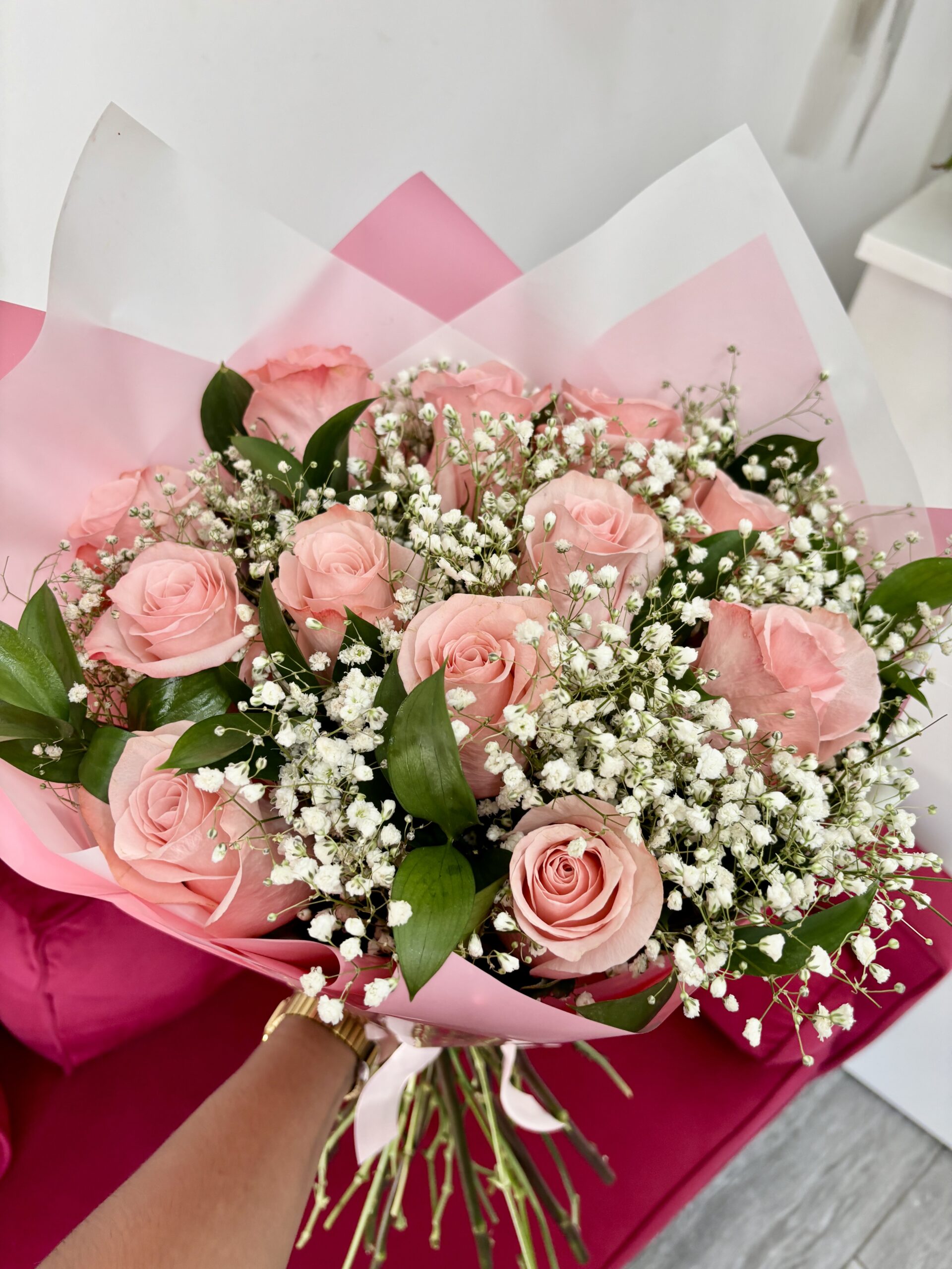 Sorprende a esa persona especial con la elegancia y dulzura de nuestro ramo de 13 rosas rosadas, delicadamente acompañado de paniculata blanca y ruscus verde natural. Un arreglo floral lleno de romanticismo y frescura, ideal para regalar en cumpleaños, aniversarios, San Valentín o simplemente para decir “te quiero”.
