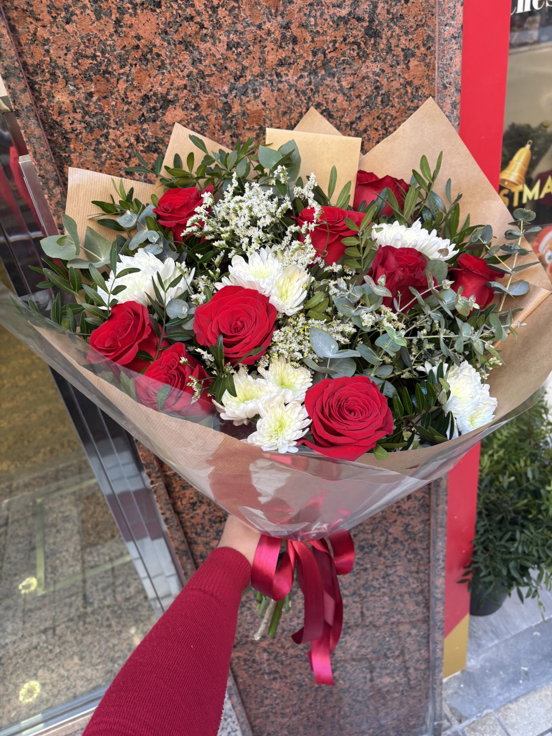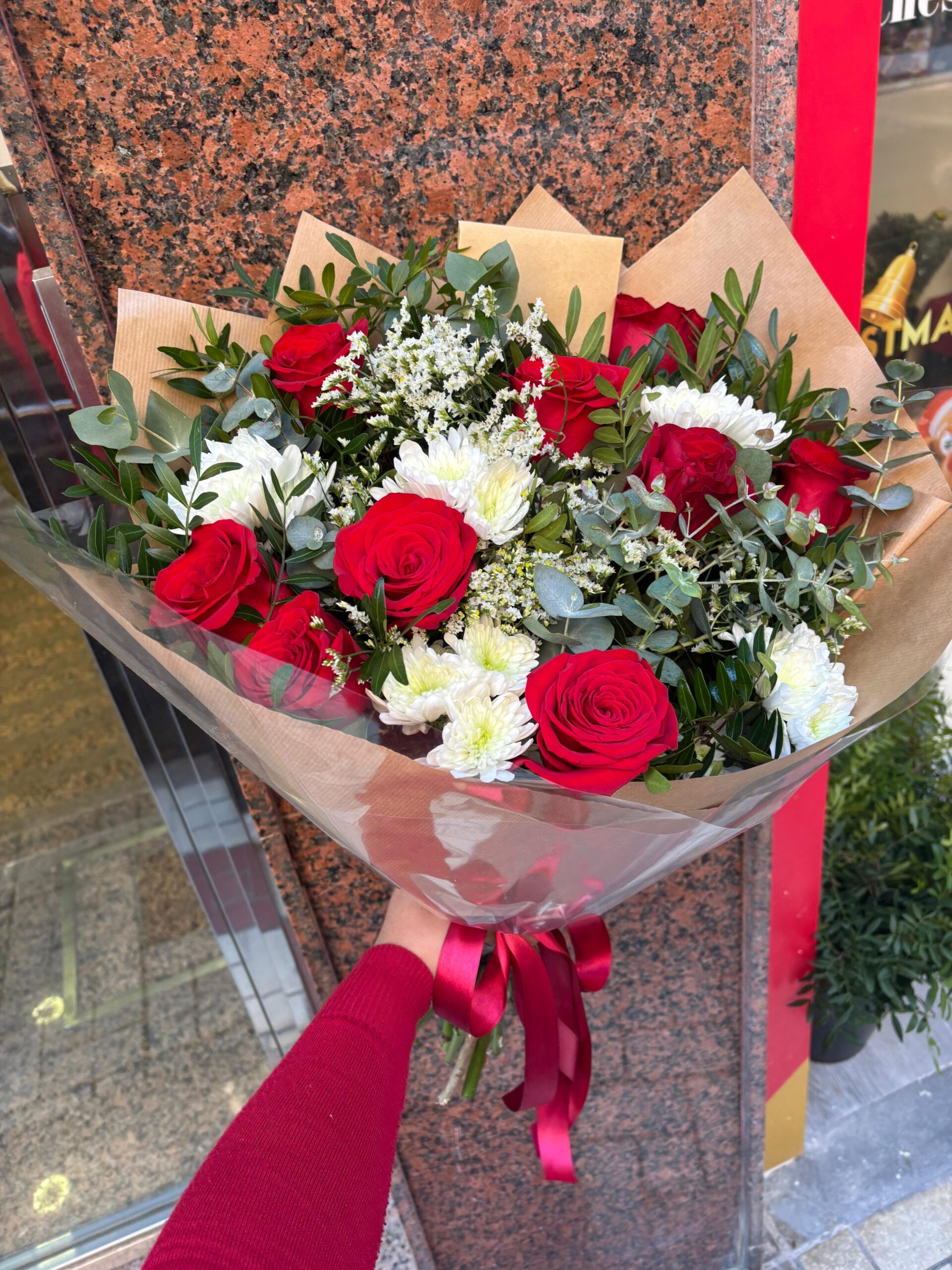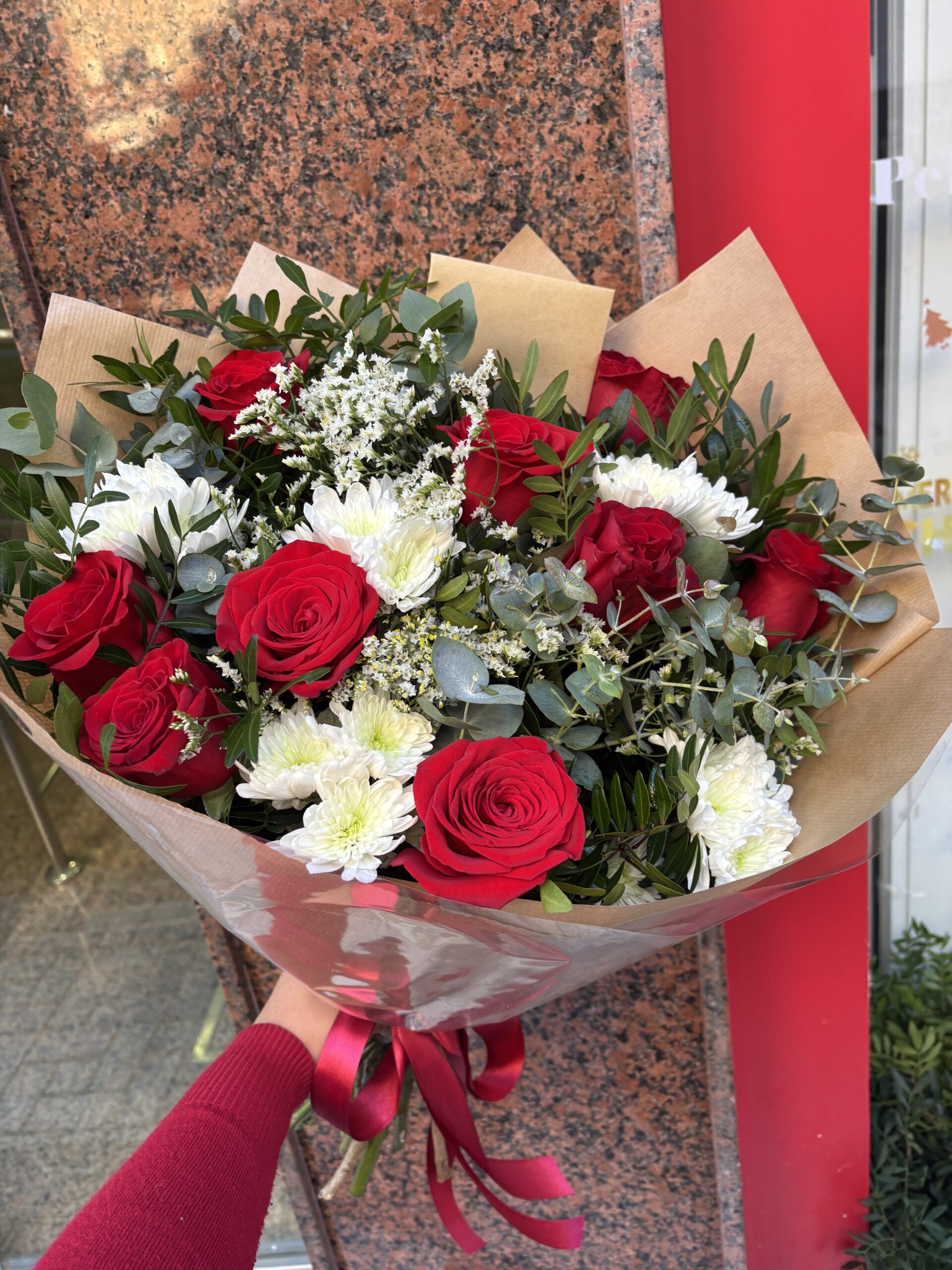Sorprende a esa persona especial con nuestro elegante ramo de 9 rosas rojas, cuidadosamente seleccionadas y combinadas con lentisco fresco, eucalipto aromático, limonium y crisantemos blancos, creando un arreglo lleno de armonía, color y textura. Este ramo es perfecto para expresar amor, cariño o admiración en cualquier ocasión, ya sea un cumpleaños, aniversario o un detalle romántico inesperado.