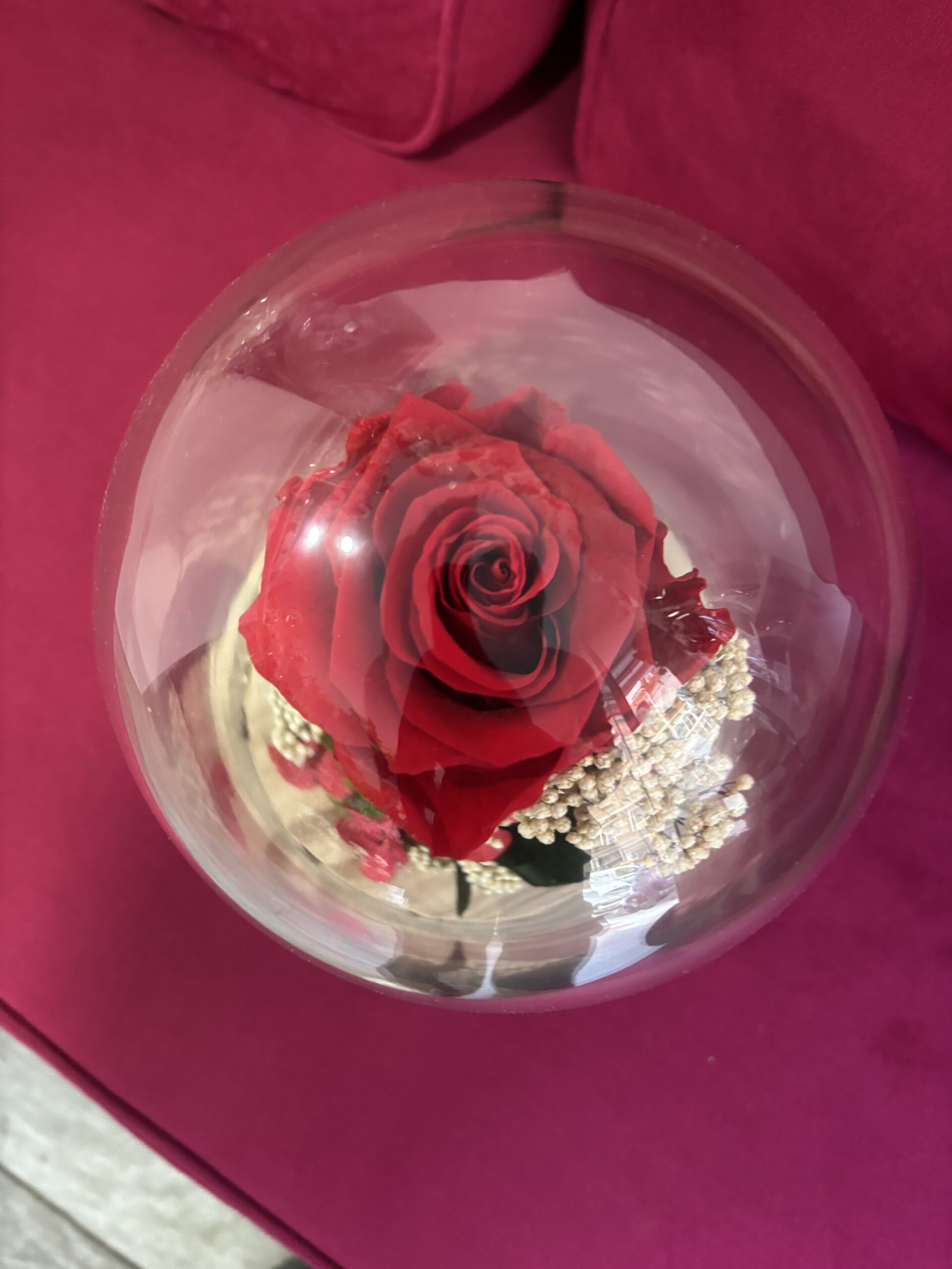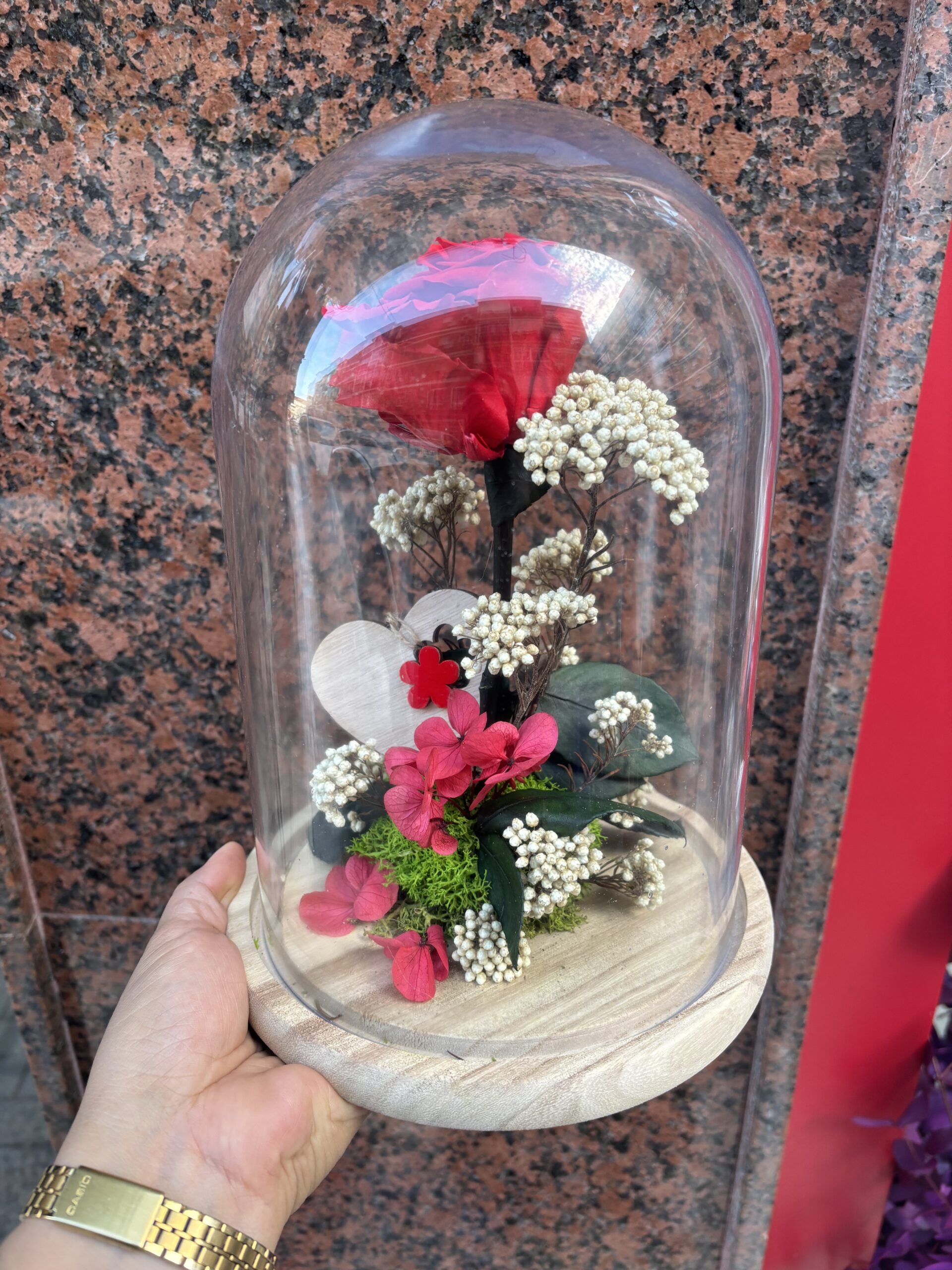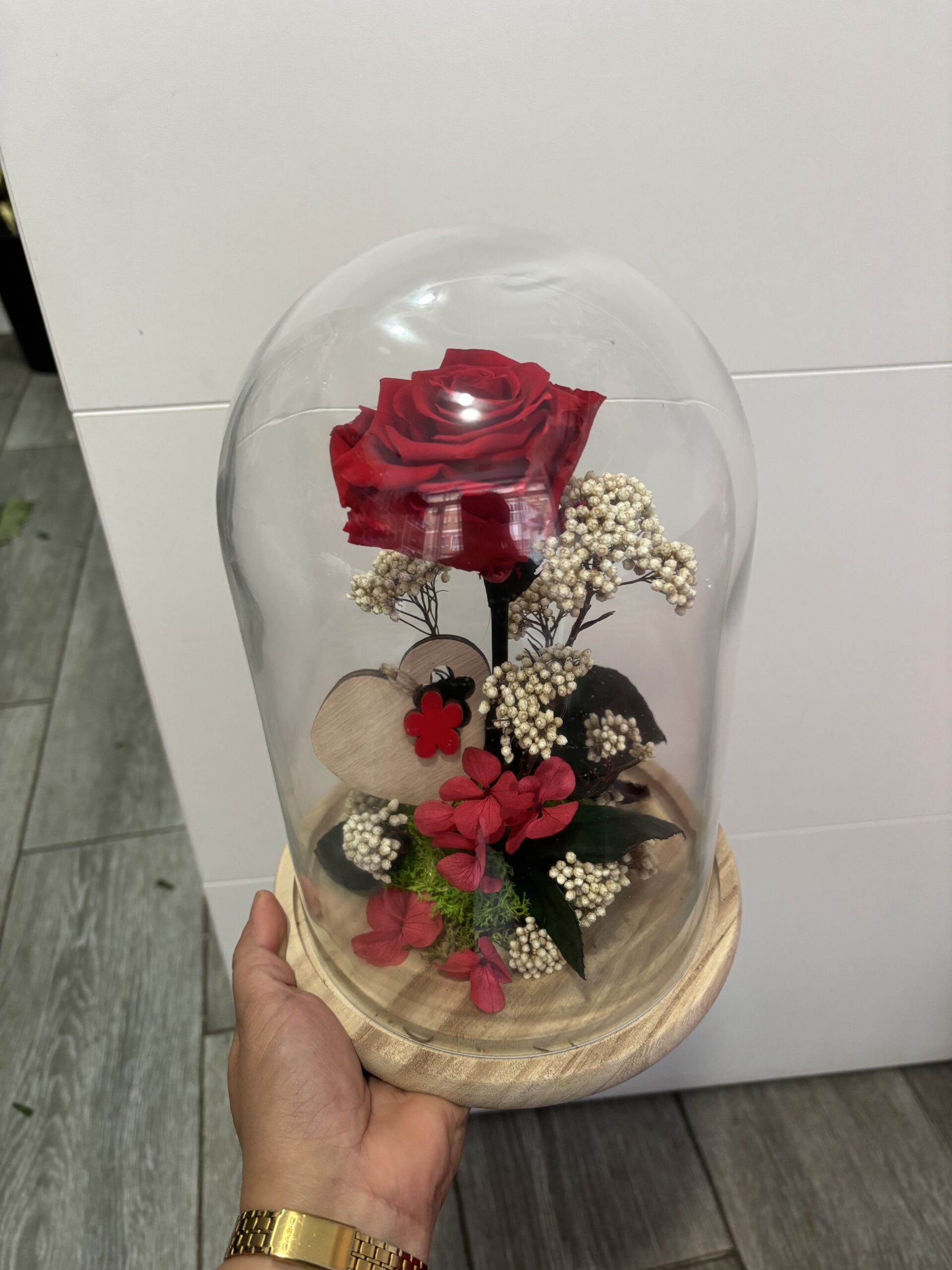 La rosa va cuidadosamente decorada y protegida en una elegante cúpula de cristal, perfecta para conservarla intacta y convertirla en un detalle decorativo único para el hogar u oficina. Es el regalo ideal para San Valentín, aniversarios, cumpleaños, declaraciones de amor o momentos especiales.